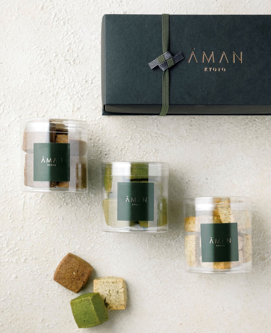 すべてはアマン京都のエグゼクティブペストリーシェフ松尾浩幸さんによるオリジナルで、京都らしい素材づかいが魅力です。京都の素材を使った上品なお菓子は、特別な方への贈りものに最適です。