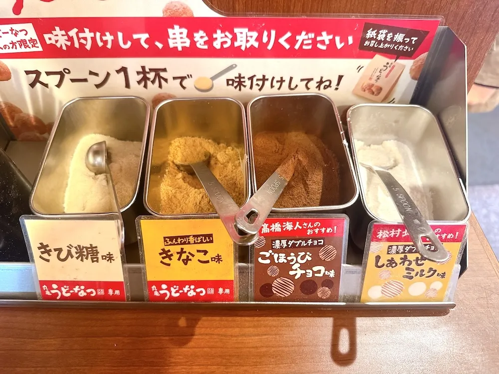 私が伺った店舗では入り口付近とレジ横に、袋入りでずらっと並んでいました。チョコレートフレーバー以外にも、きなこ味やきび糖味があります。袋の口が開いているのはなぜだろうと思ったのですが購入後にわかりました。棚に置かれているパウダーをスプーン一杯分入れて、味つけをするためです。