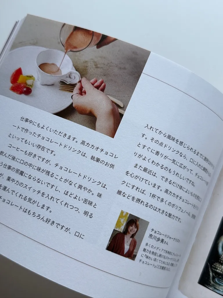 私には毎日、欠かさず続けている習慣があります。それは、チョコレートドリンクをいただくことです。明治さんの本の中でもお話ししていて、以前、丁寧に取材していただきました。もしご興味があれば、手に取ってみてください。