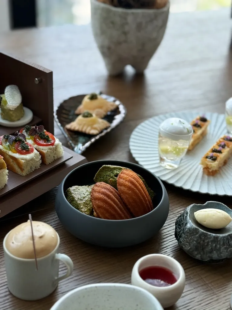 アフタヌーンティーが提供されるダイニングNiNi。先日初めて伺ったのですが、心地よいです。自然との共生をコンセプトに掲げるホテルらしく、空間全体に木材や石、植物といった天然素材が取り入れられ、開放感がありました。