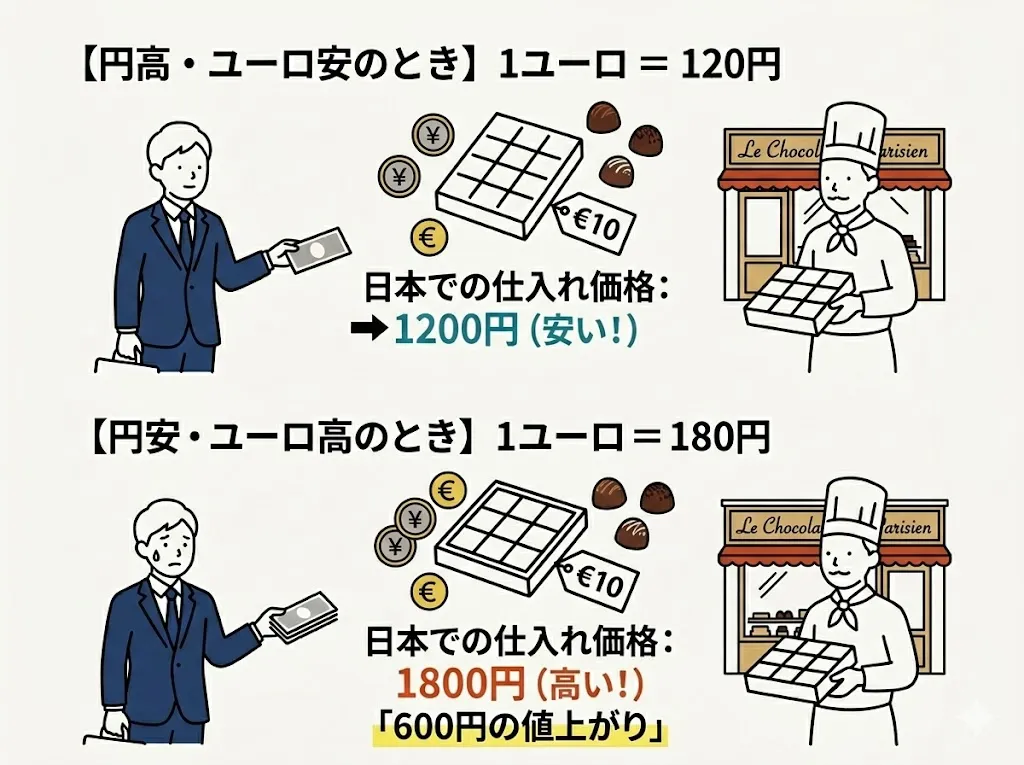 たとえば、完成品としてヨーロッパから輸入されるチョコレートは、多くがユーロ建てで取引されています。ユーロ高・円安になれば、日本の輸入業者が支払うコストが上がります。