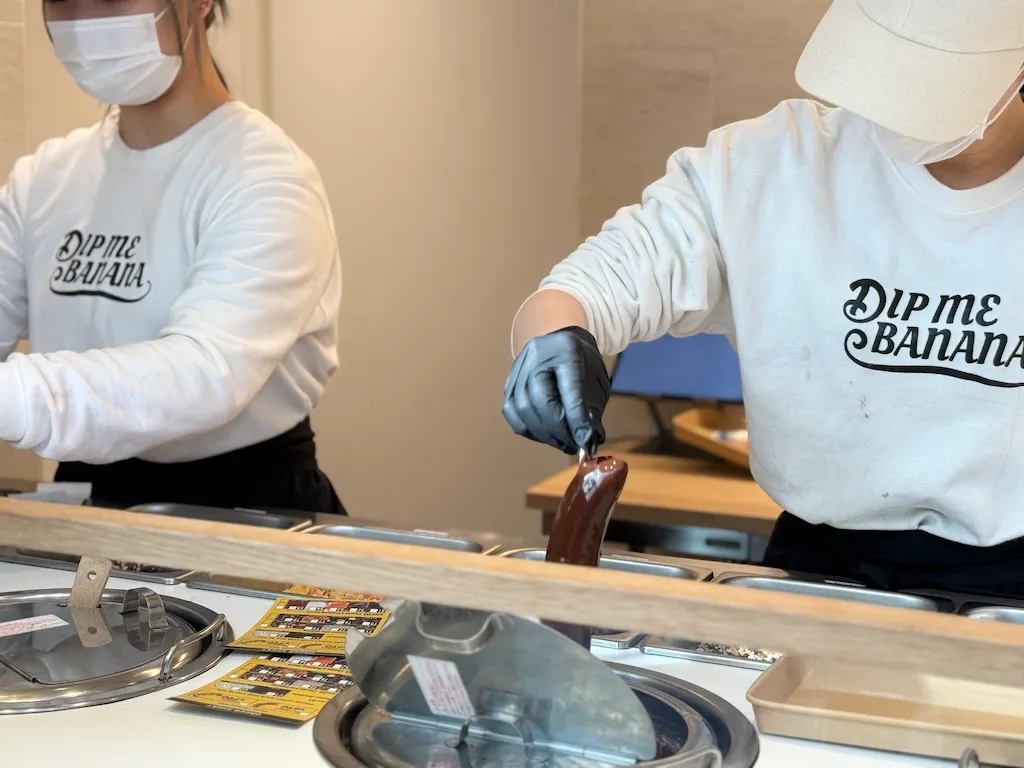 「DIP ME BANANA」は、2025年10月に原宿・竹下通りにオープンした、チョコバナナ専門店です。アメリカで人気のチョコバナナと日本のチョコバナナのスタイルを取り入れ、楽しくカスタマイズできるようにと進化させたお店。原宿・竹下通りのちょうど中程にあって、観光客やショッピングを楽しむ人々でいつも賑わっています。
