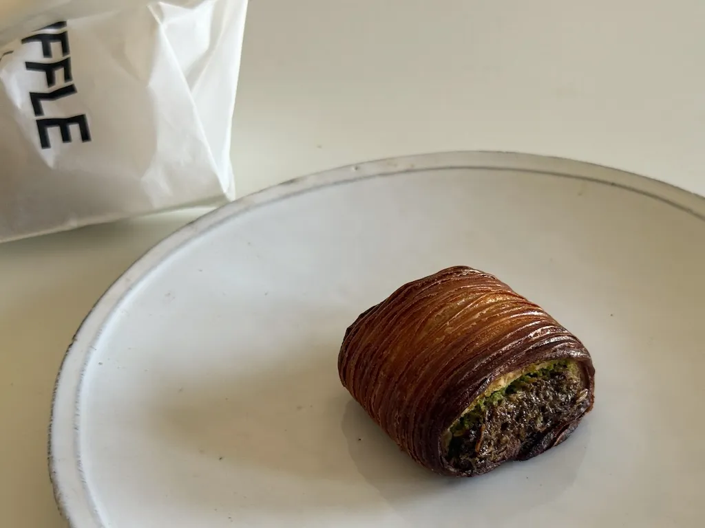 パンの世界でも注目の一品があります。TruffleBAKERYの「ドバイチョコデニッシュ」は、焼き上がりのたびにすぐ完売し、購入はおひとり1点に制限されているほどの人気ぶり。パリっとしたクロワッサン生地がザクザク感を引き立て、温めるとバター風味が広がります。