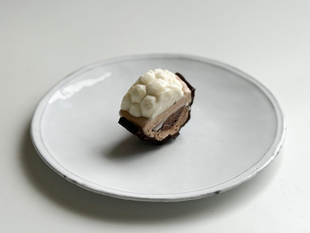 R:このメキシコ産カカオのチョコレートは、私がよく使っているものです。風味に丸みがあり、酸味が強すぎず、苦味も控えめで、アイスクリームに適しています。今回はこのチョコレートをソルベにしました。カカオの持つ力強さを表現できるからです。このチョコレートはソルベにするからこそ個性が際立ちます。それによってこのケーキは、外側はやさしい味わいですが、中にはしっかりとしたパンチがあります。