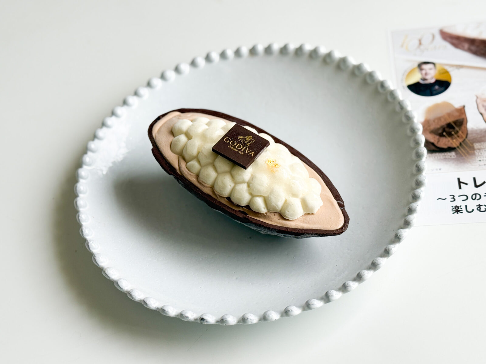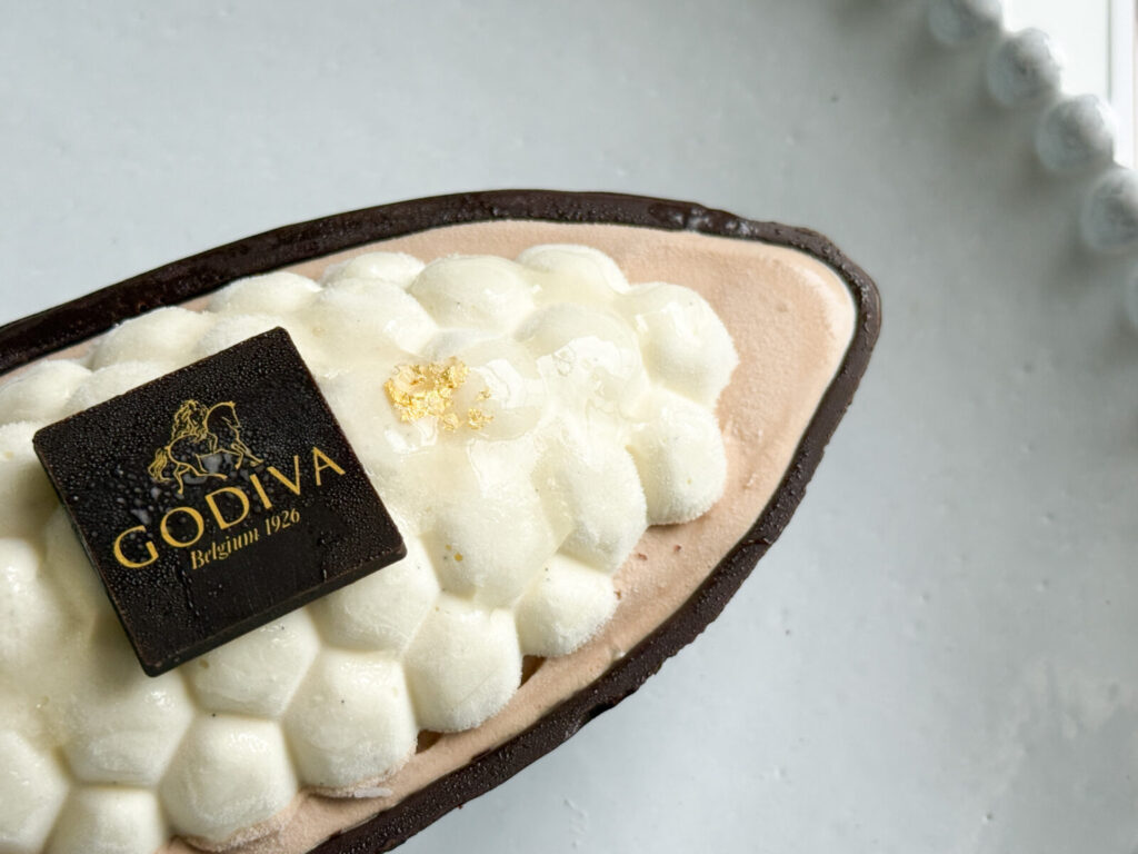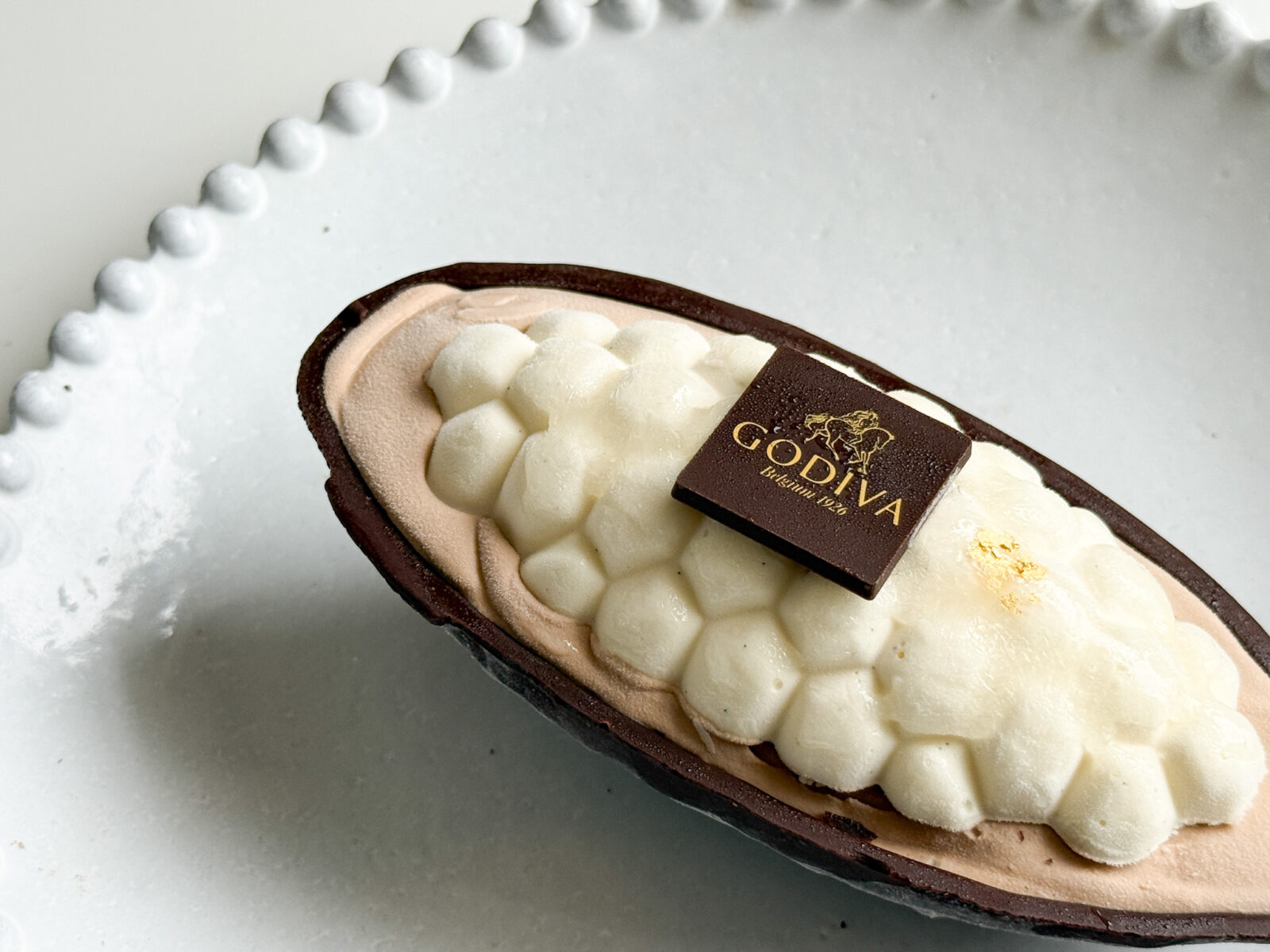 R:カカオの実なくして、ゴディバは存在しませんし、チョコレートそのものも生まれません。ゴディバというブランドが100周年を迎えられたことへのリスペクトと、原材料であるカカオへのオマージュも、この形で表しました。チョコレートには、ミルク、ダーク、ホワイトと主に3種類があり、そのすべてを使わない手はないと思いました。ミルクはやさしさ、ホワイトはまろやかさ、そしてダークはカカオの力強さ。そういった個性を活かしつつ、ケーキ全体の最高のバランスを作りたいと考えたからです。