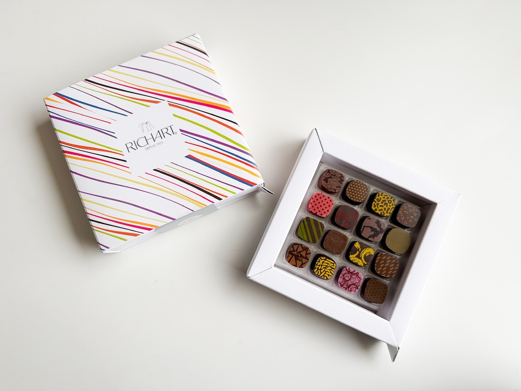 リシャールの特徴は、美しさにあります。ショコラの表面に施された色鮮やかな転写プリント、それがボックスに並ぶ様子は、まるでキャンバスに描かれたアートのよう。かつて日本に店舗があった際も、そのモダンなビジュアルが好きだった方も多いのではいでしょうか。